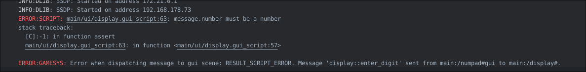 Which doesn't only tell us exactly where the error occurred (main/ui/display.gui_script at line 63) but also from where it was dispatched (sent from main:/numpad#gui)
