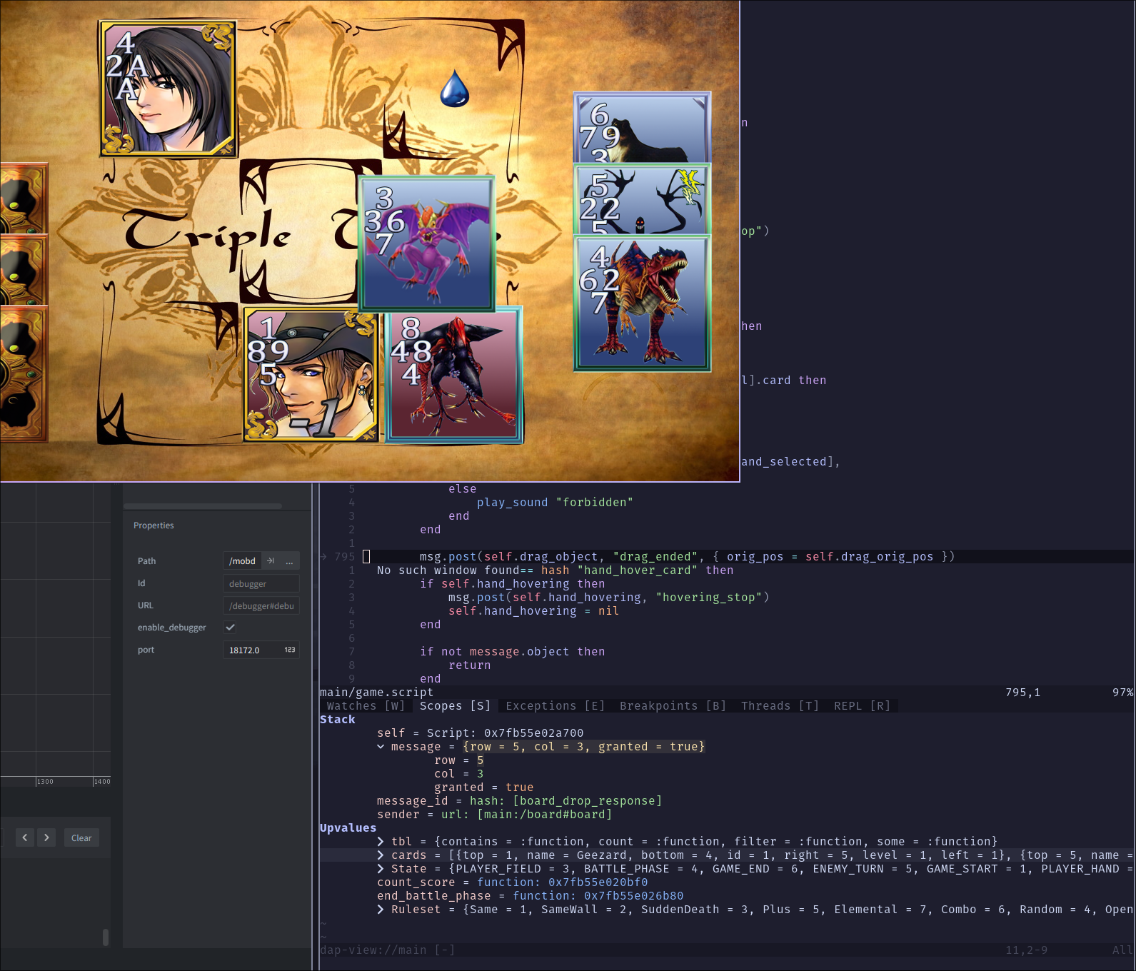 Combining these two used to be quite a challenge. You needed to setup the LSP with special annotations, opening Neovim from Defold as an external editor is a pain due to it being a terminal program, and debugging was often annoying. This is also why I made defold.nvim, a Neovim plugin that automatically does all the configuration for you.